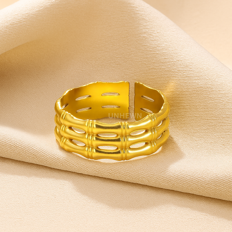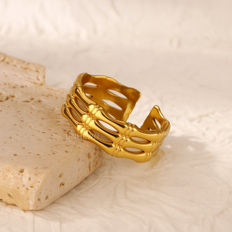 Bring natural elegance to your style with the Golden Bamboo Statement Ring. Featuring a unique openwork bamboo-inspired design, this bold yet refined piece captures both strength and sophistication. Crafted with rich gold plating and a comfortable adjustable fit, it’s perfect for adding a touch of artistry to your everyday look or making a striking statement on special occasions.