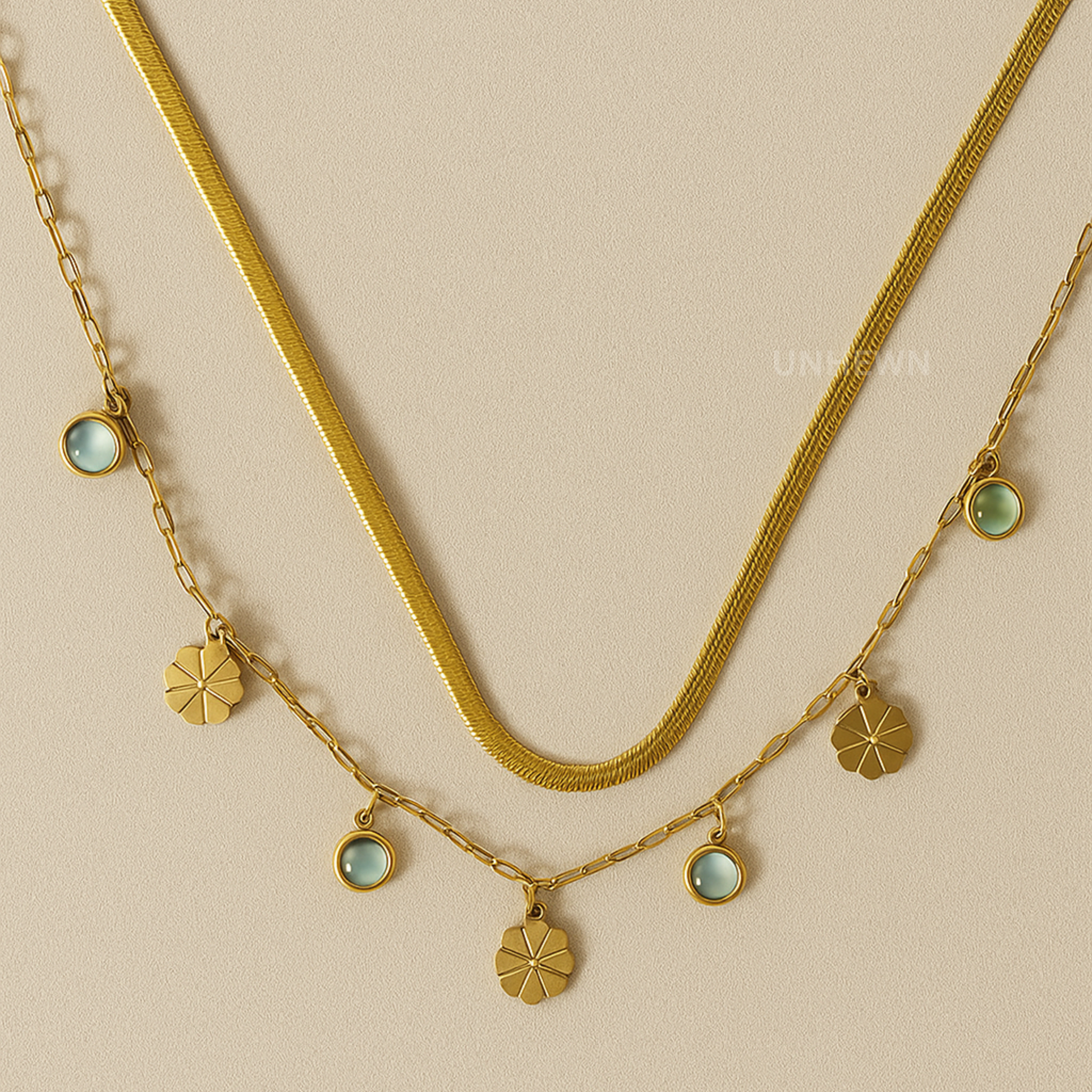A delicate, two-tiered necklace adorned with gold flower discs and soft aqua gemstone charms. Perfect for layering, this piece brings effortless elegance and a touch of playful charm to any outfit.