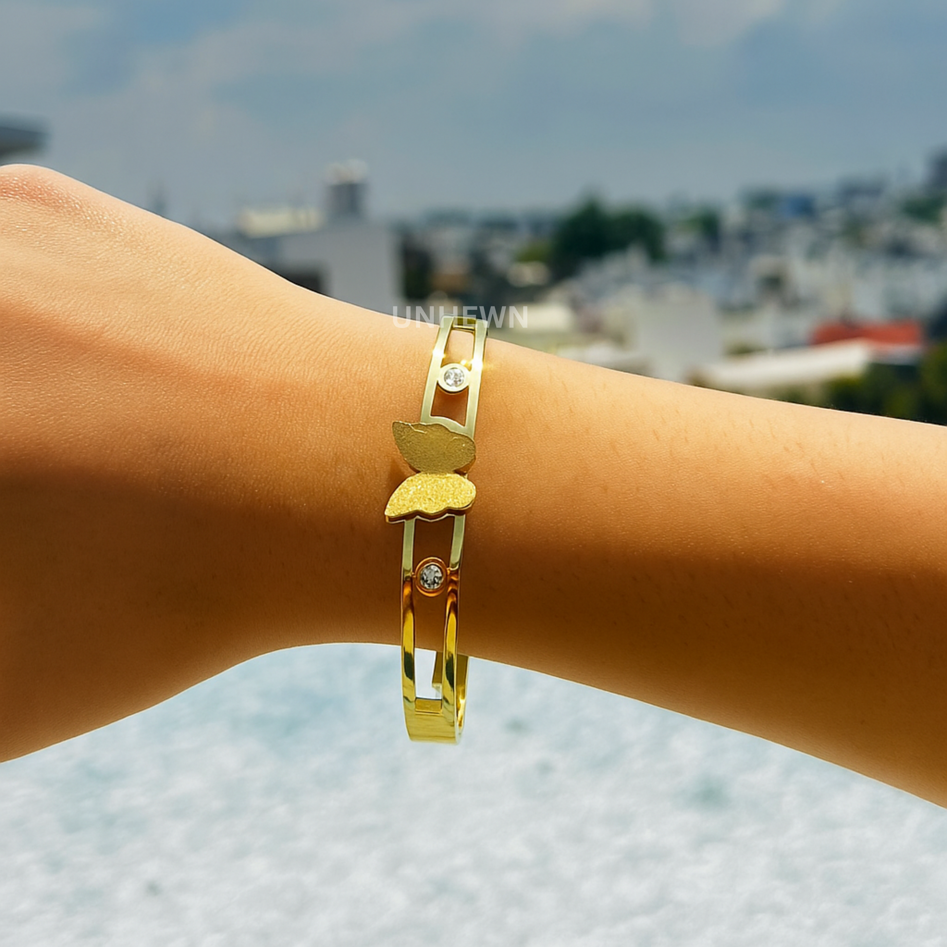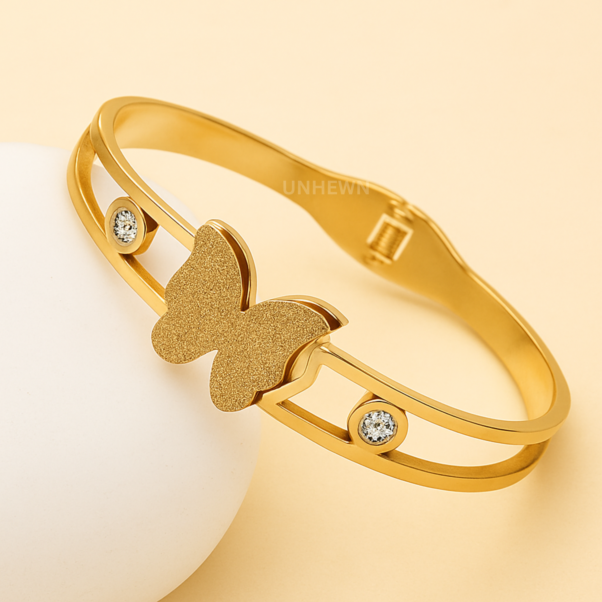 Elegant and radiant, the Golden Butterfly Crystal Cuff Bracelet combines modern design with timeless beauty. Featuring a shimmering butterfly charm at its center and sparkling crystal accents on each side, this bracelet adds a refined touch to any outfit. Its openwork band design makes it both stylish and comfortable for everyday wear or special occasions.