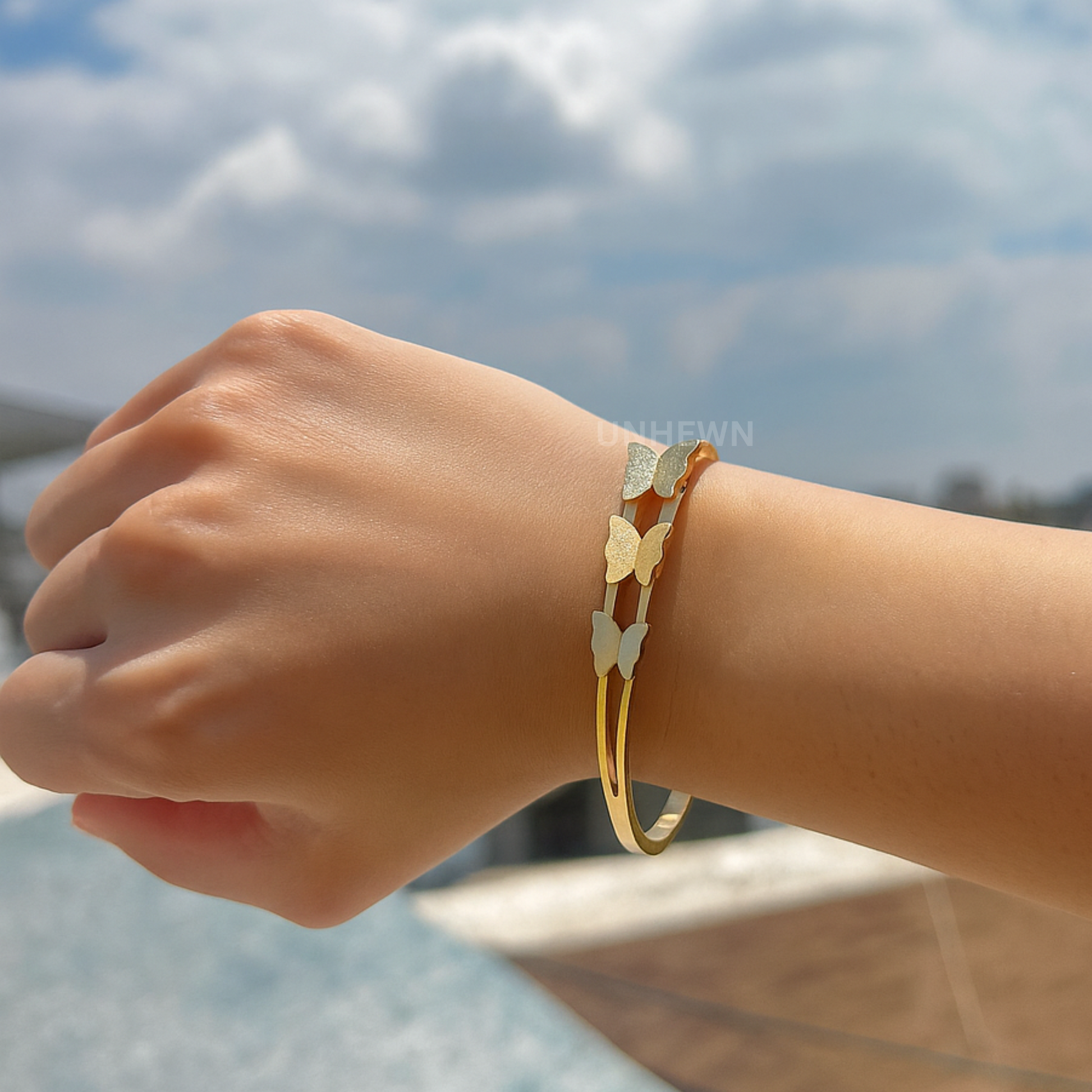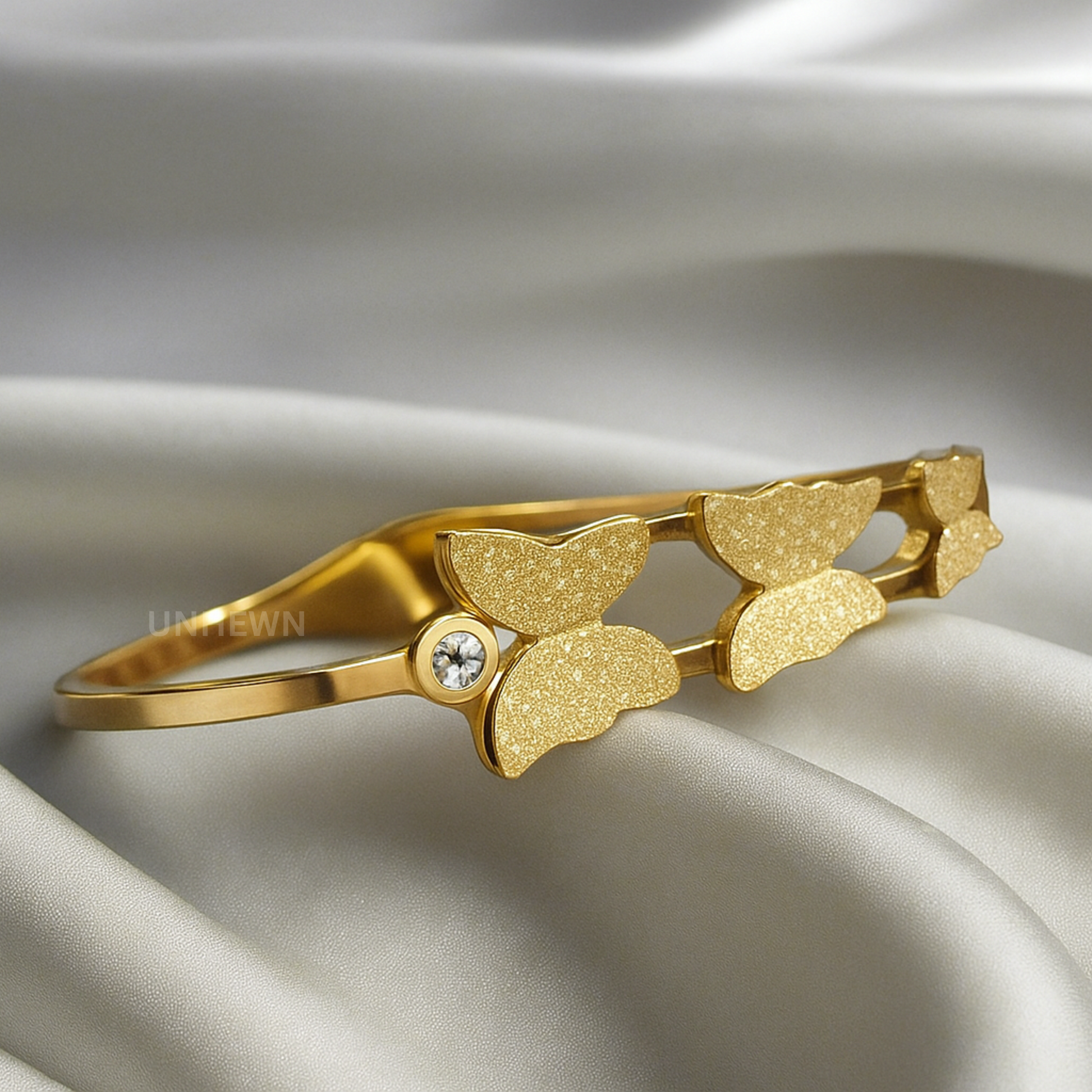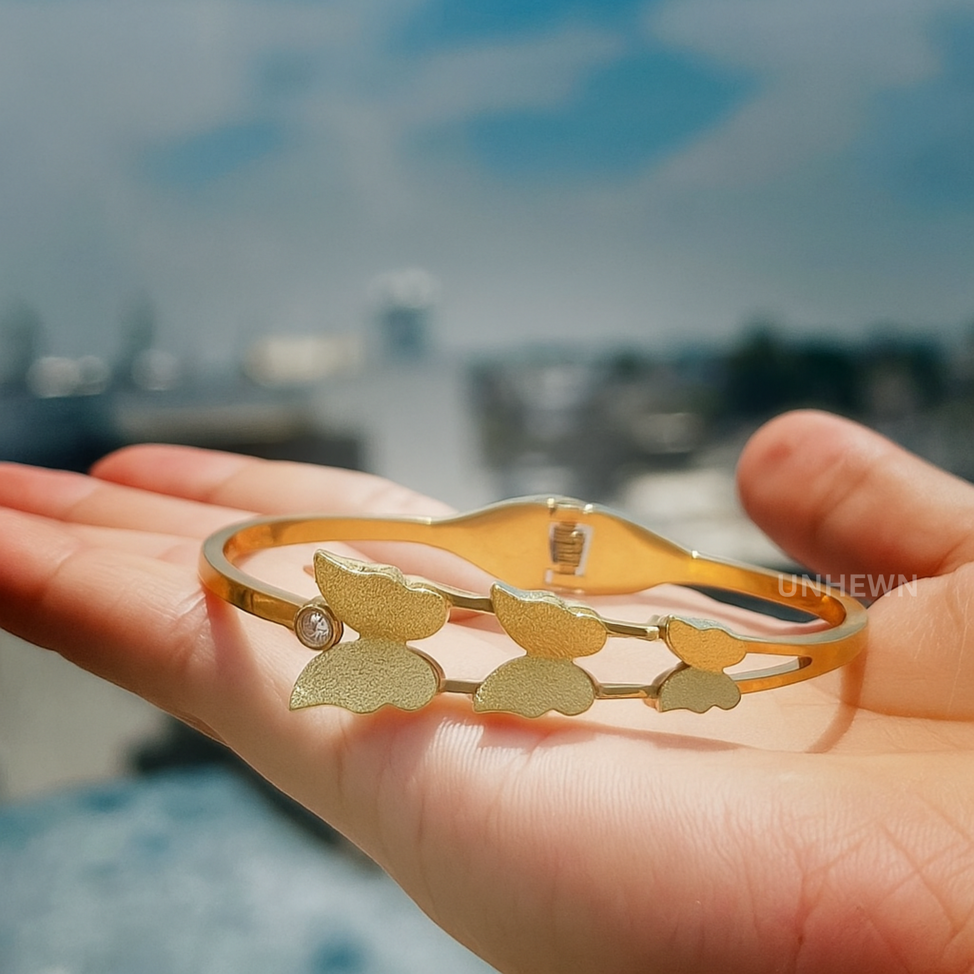 Inspired by the elegance of butterflies in motion, the Golden Butterfly Flight Bracelet features a trio of textured butterfly charms set along a sleek golden band. A sparkling crystal accent completes the design, adding a refined shimmer. Lightweight yet durable, this bracelet is perfect for everyday elegance or as a thoughtful gift for someone special.