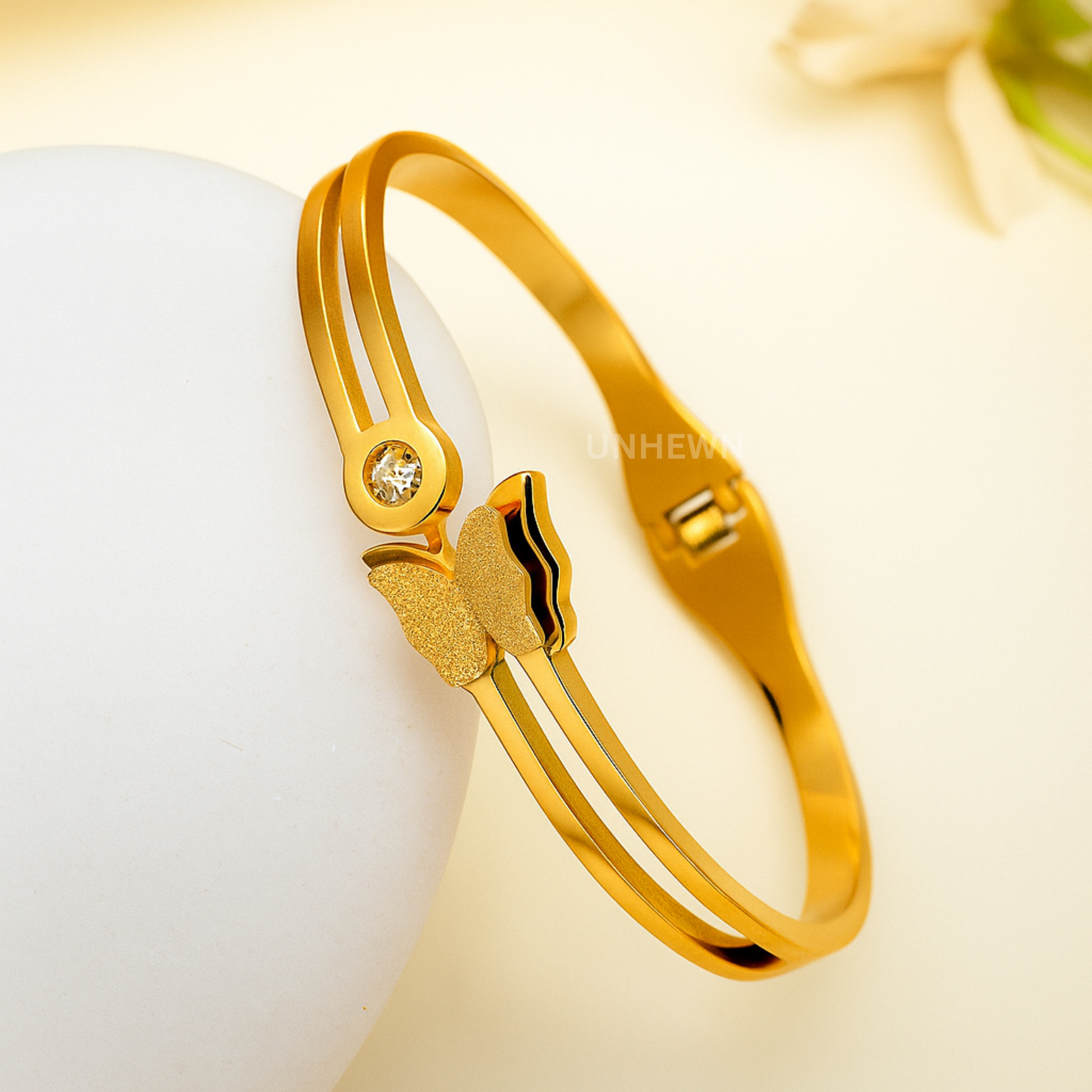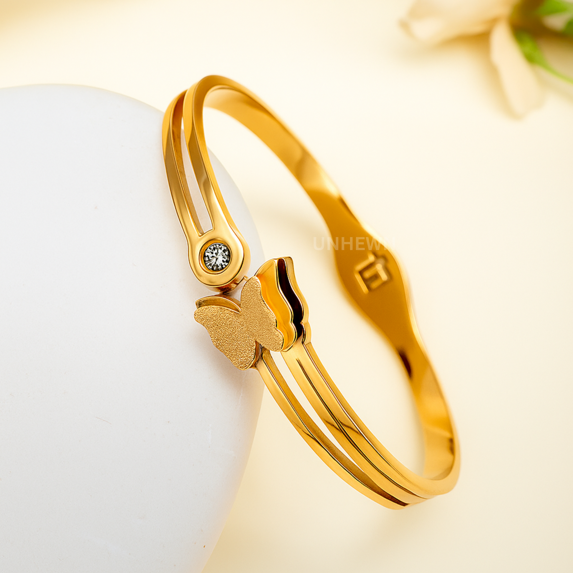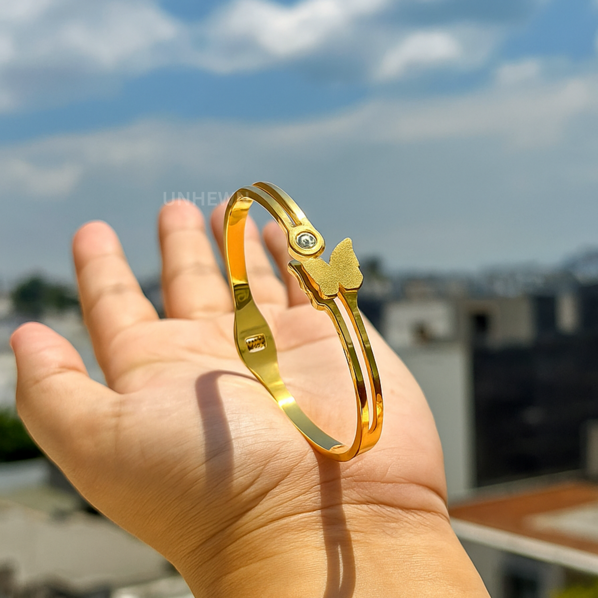A graceful blend of elegance and charm, the Golden Butterfly Harmony Bracelet features a sleek dual-band design with a delicate butterfly centerpiece. Accented with a sparkling crystal, this bracelet brings a touch of sophistication to both casual and dressy looks. Whether worn alone or layered with other favorites, it’s a timeless piece that symbolizes beauty and transformation.