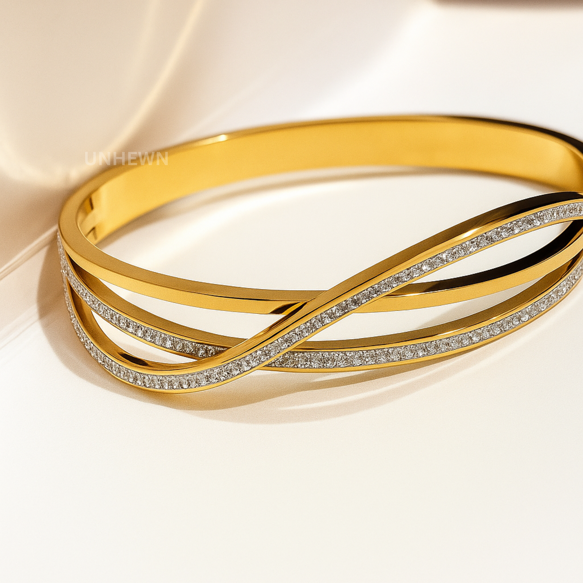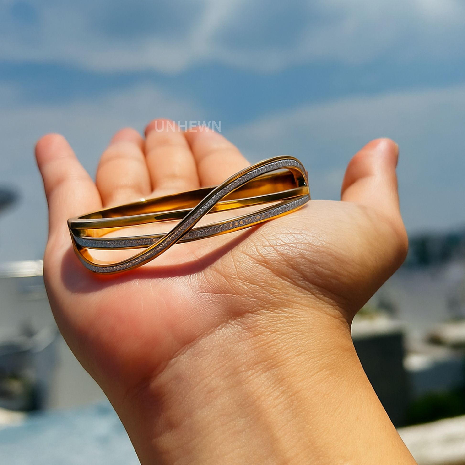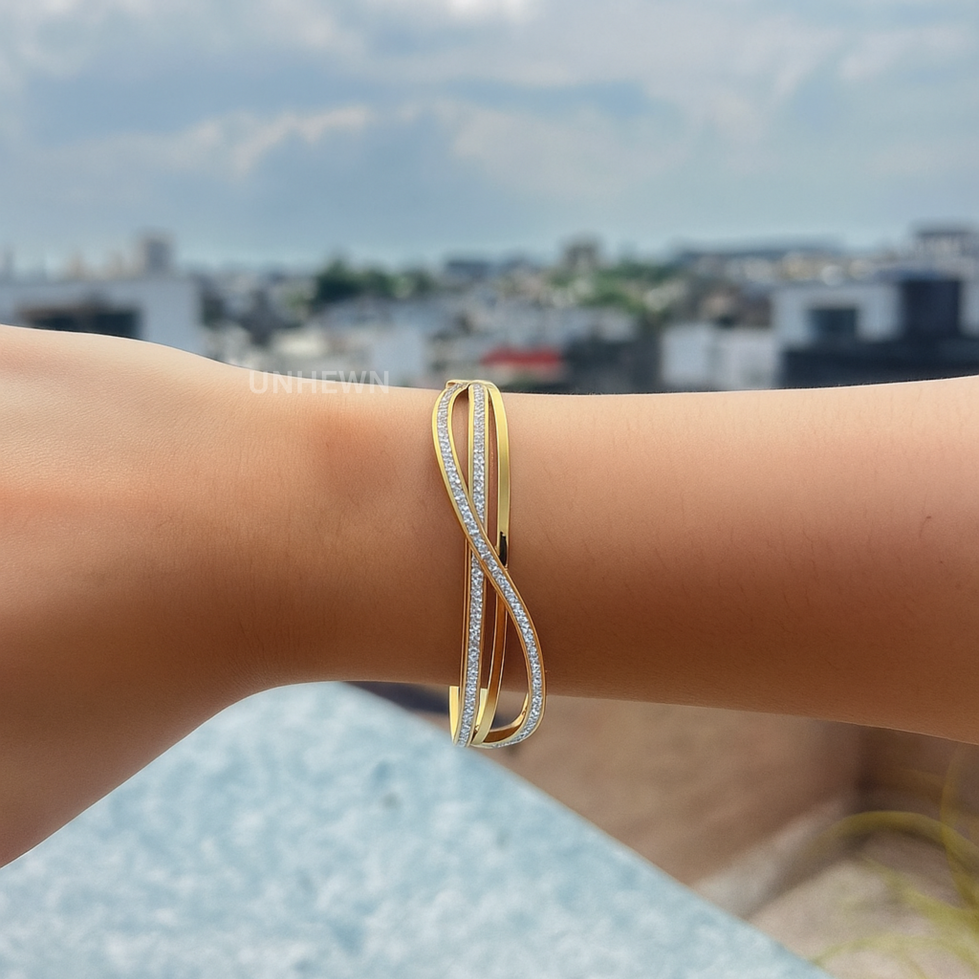 The Golden Infinity Crystal Bracelet exudes timeless elegance with its graceful crisscross design. Two golden bands intertwined with sparkling crystal accents create a look of infinite sophistication. Perfect for special occasions or elevating your everyday style, this bracelet adds a radiant touch to any outfit.