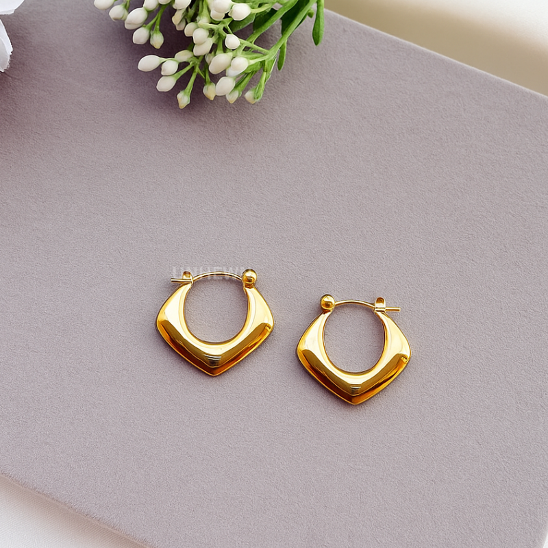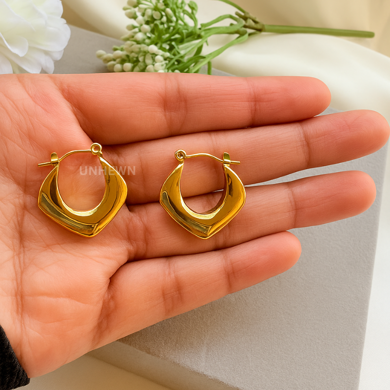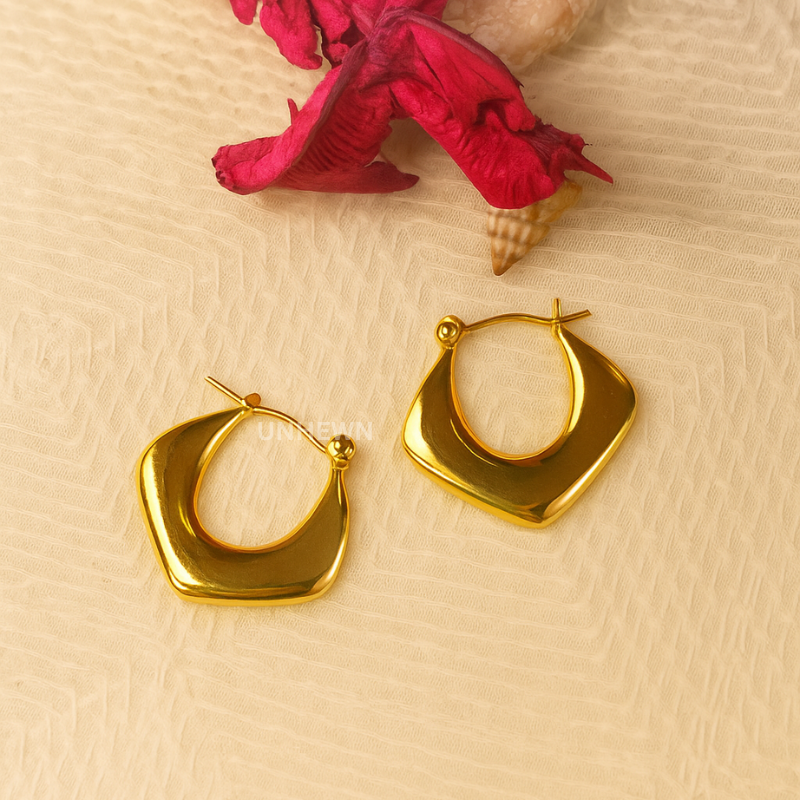 Step into bold elegance with the Golden Mirage Hoop Earrings, featuring a unique geometric silhouette that blends modern edge with timeless charm. Crafted from high-quality 316L stainless steel and coated in rich gold plating, these hoops are designed to make a statement while staying lightweight and comfortable. Perfect for day-to-night styling, they add a striking twist to your jewelry collection.