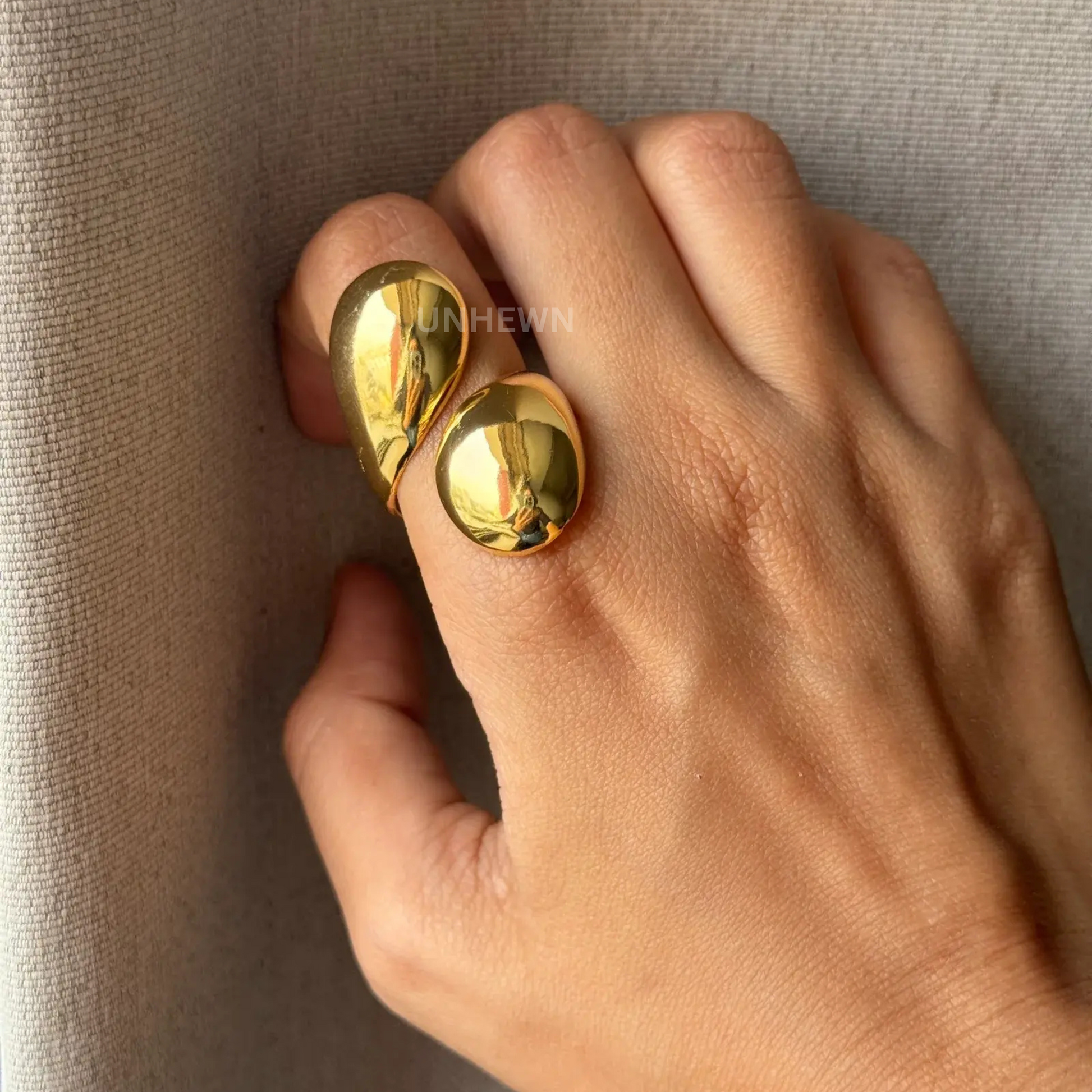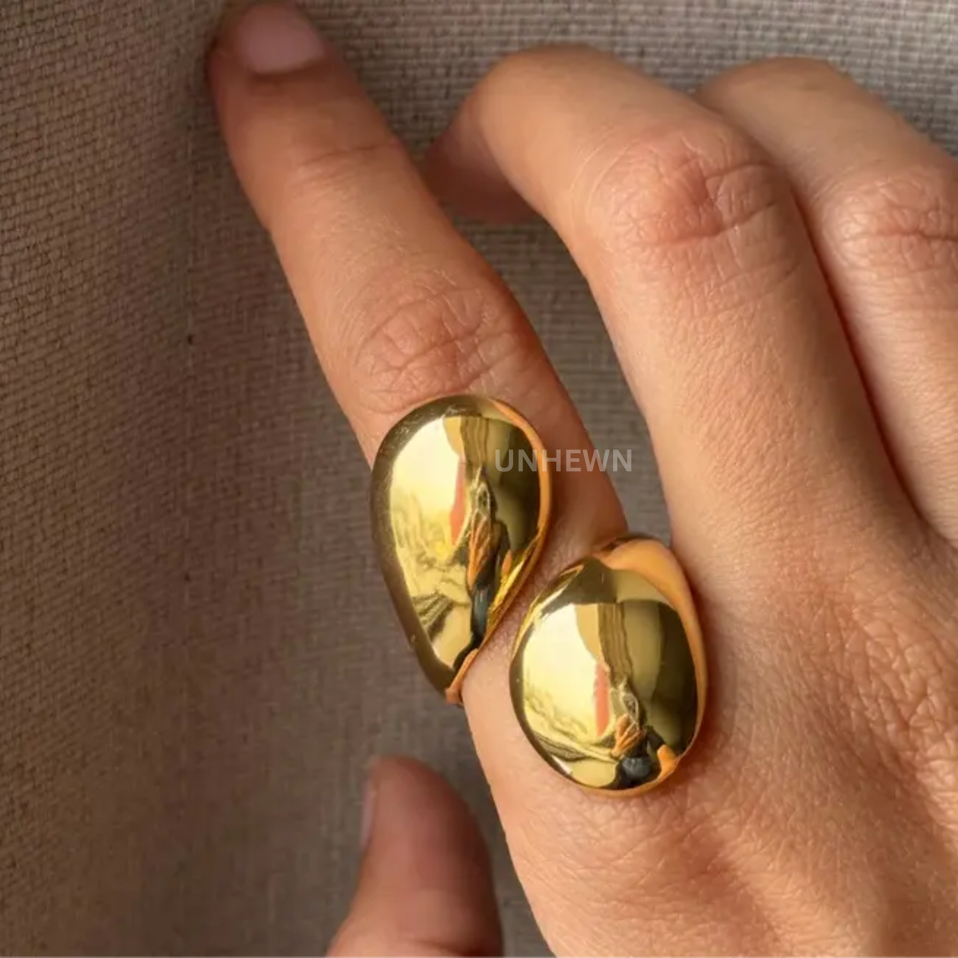 Bold and sculptural, the Golden Orbit Statement Ring features two polished gold domes that catch the light from every angle. With its open design and fluid curves, this piece feels both modern and organic - perfect for adding a touch of artful sophistication to any look. Adjustable for a comfortable fit, it’s a statement-maker you’ll reach for time and again.