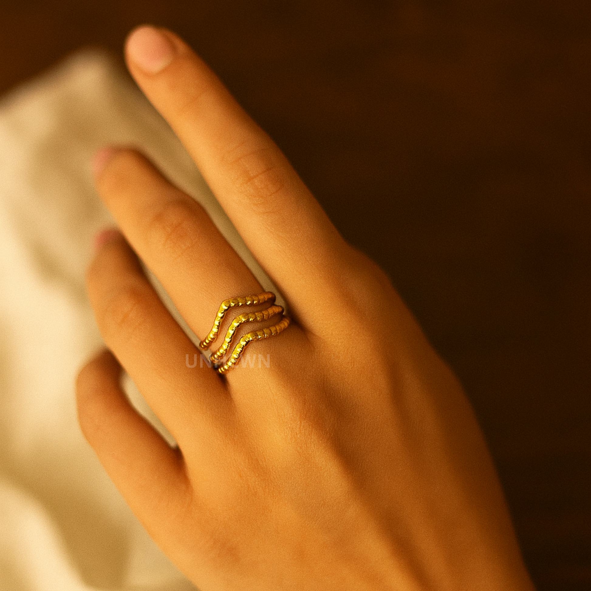 Three-tiered elegance, the Luma Wave Set features fluid, ripple-like curves with a beaded texture. Designed to be worn stacked or solo, this statement ring adds movement and warmth to every gesture. Finished in radiant gold tone.