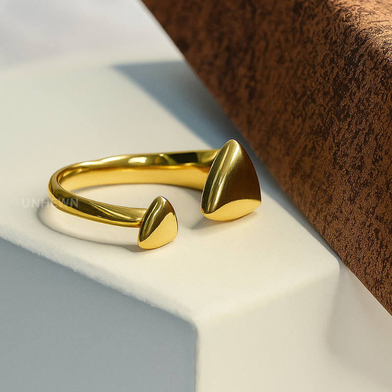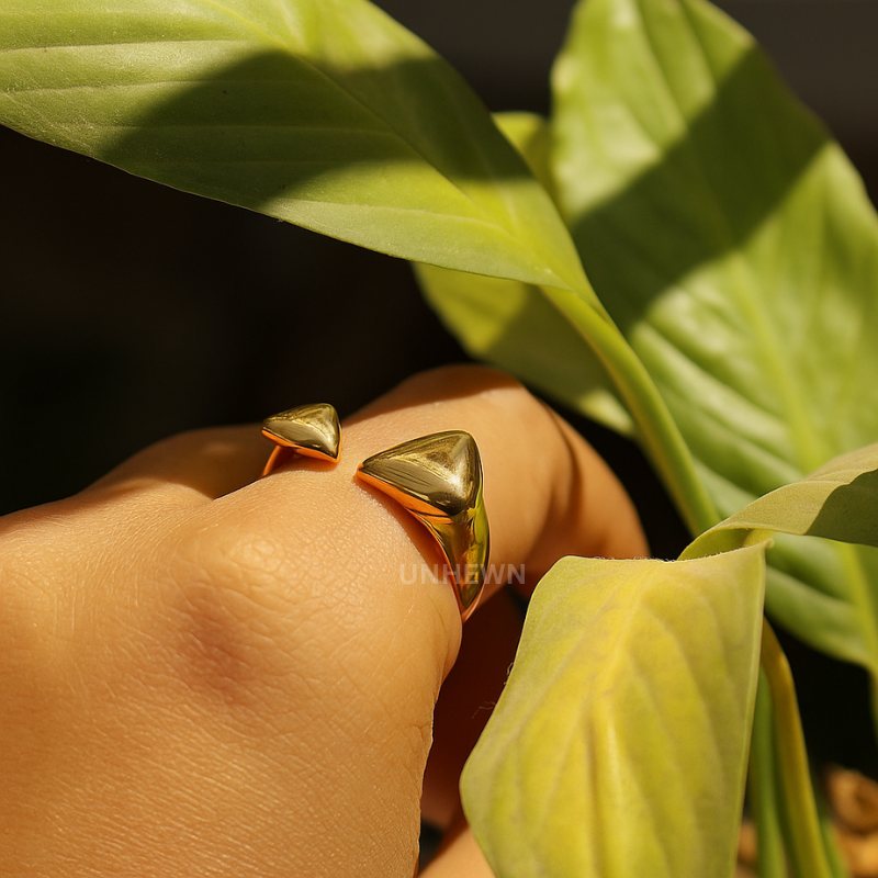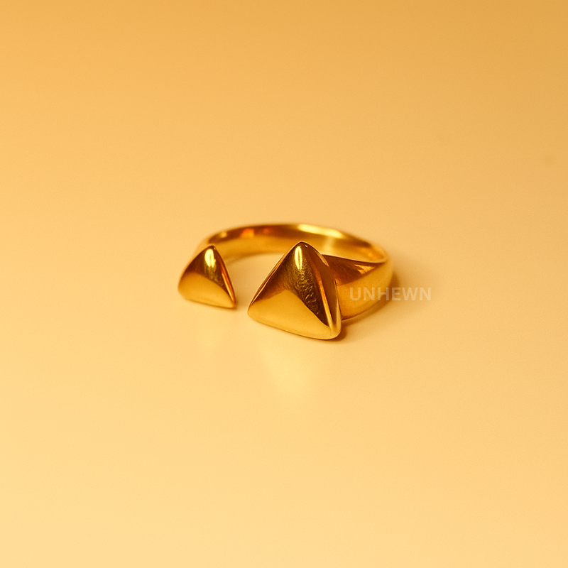 Sleek and contemporary, the Modern Edge Open Ring is designed with bold triangular accents on each end, creating a striking balance between minimalism and statement style. Crafted with premium gold plating, this adjustable ring adds a touch of modern sophistication to any outfit. Perfect for stacking or wearing solo, it’s a versatile piece for everyday elegance.