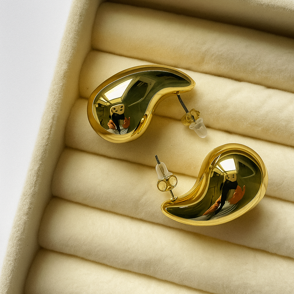 Bold yet refined, the Molten Curve Studs are a statement in fluid design. Their polished, mirror-like surface reflects light beautifully, while the organic bean-like silhouette adds a sculptural edge to your look. Lightweight and striking, these earrings elevate minimal styling with effortless drama.