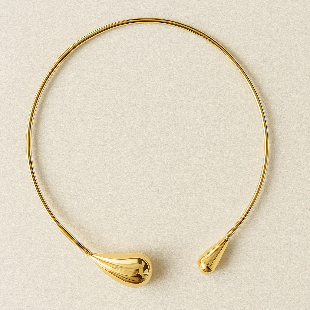 A bold, modern collar necklace with sculpted teardrop ends, finished in radiant gold. This statement piece blends minimalism with artistic form, perfect for contemporary style lovers.