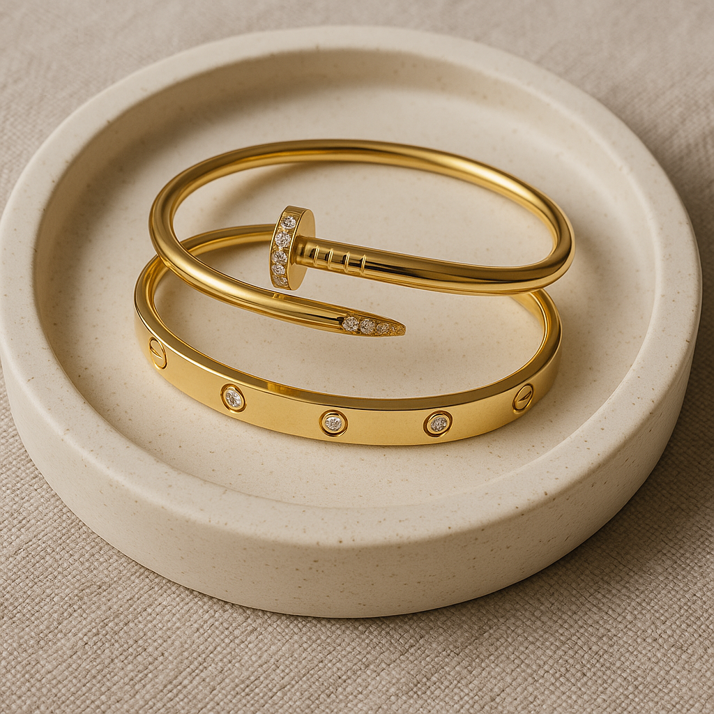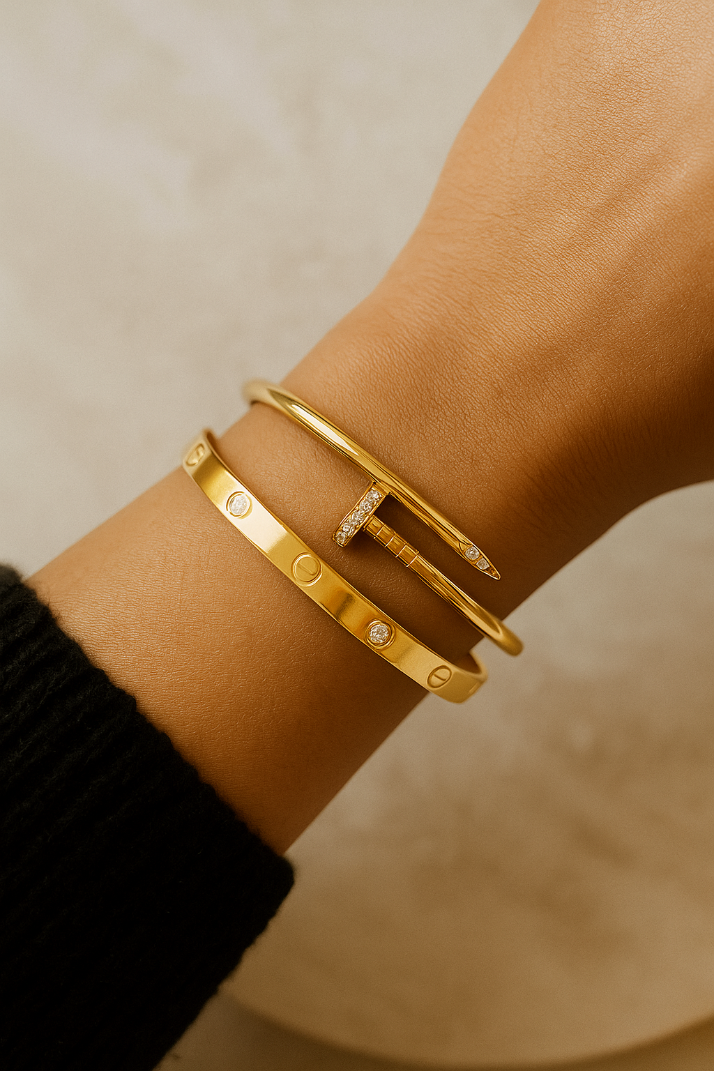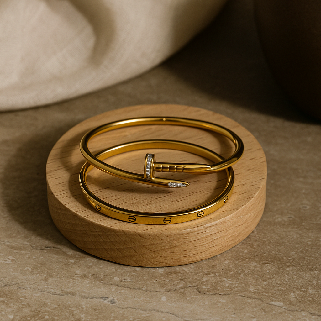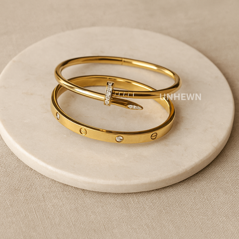 This striking duo blends bold structure with elegant brilliance. Featuring a sleek nail-inspired bracelet adorned with pavé stones, paired with a screw-detailed stud bracelet set with subtle crystals - the perfect combination of modern edge and timeless shine.