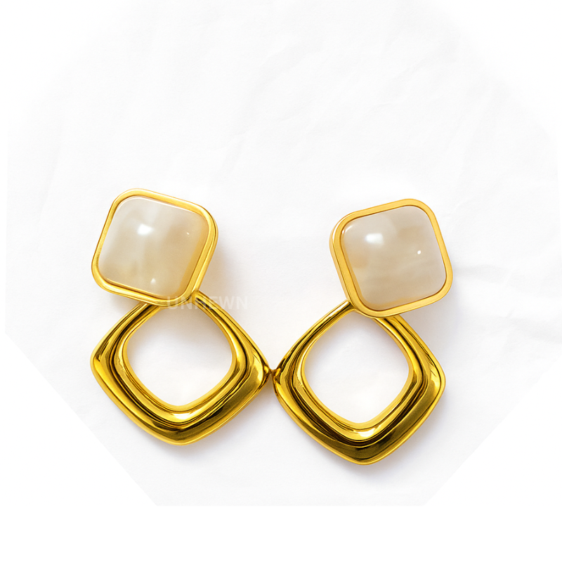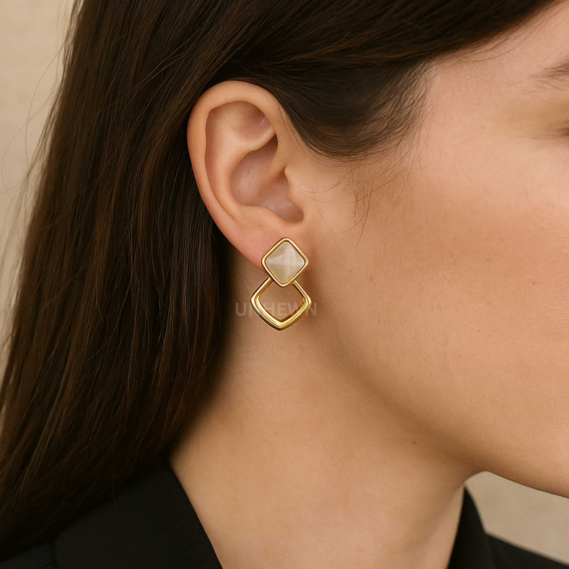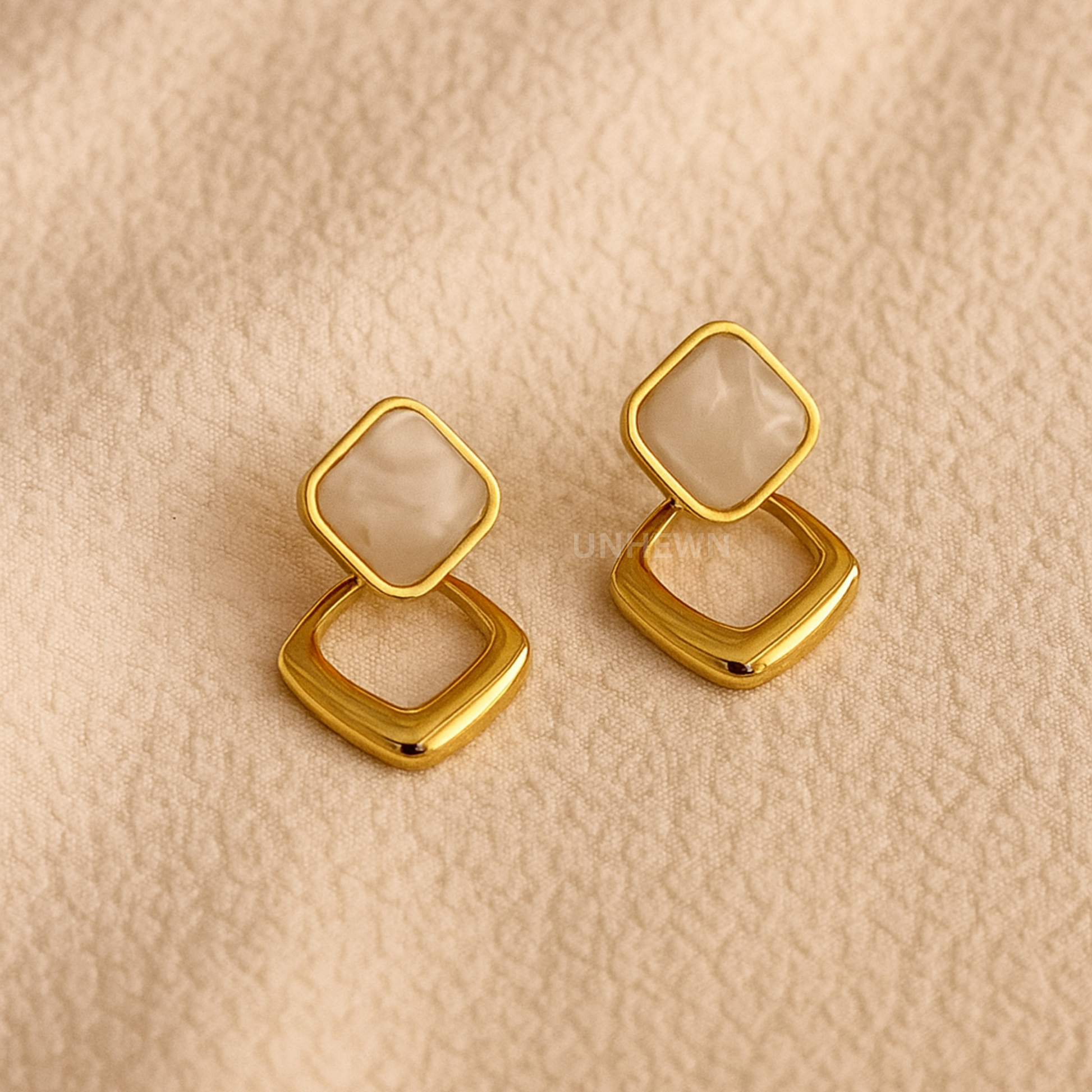 A symphony of soft contrast, the Solace Duo Earrings balance creamy pearl-like tones with bold golden edges. The upper marbled diamond connects to a sculpted open-frame base, creating a clean geometric silhouette. Whether styled for work or weekends, this pair elevates any outfit with modern calm and quiet confidence.