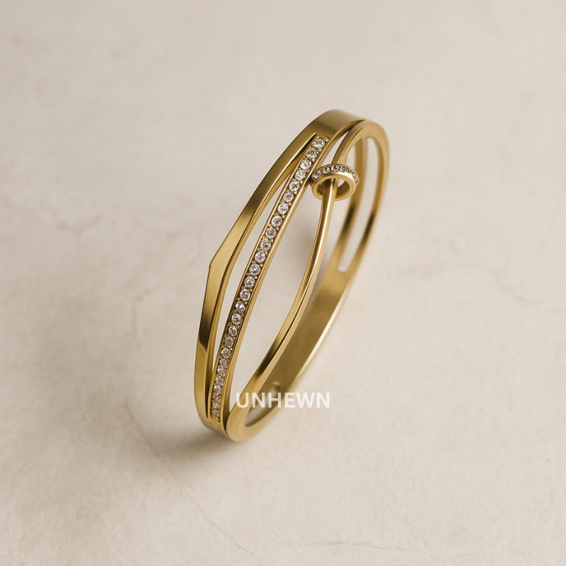 Where structure meets sparkle. The Swerve Pavé Bracelet curves with a twist and glimmers with a full line of handset stones. Designed to be noticed, yet balanced enough to wear solo or stacked.