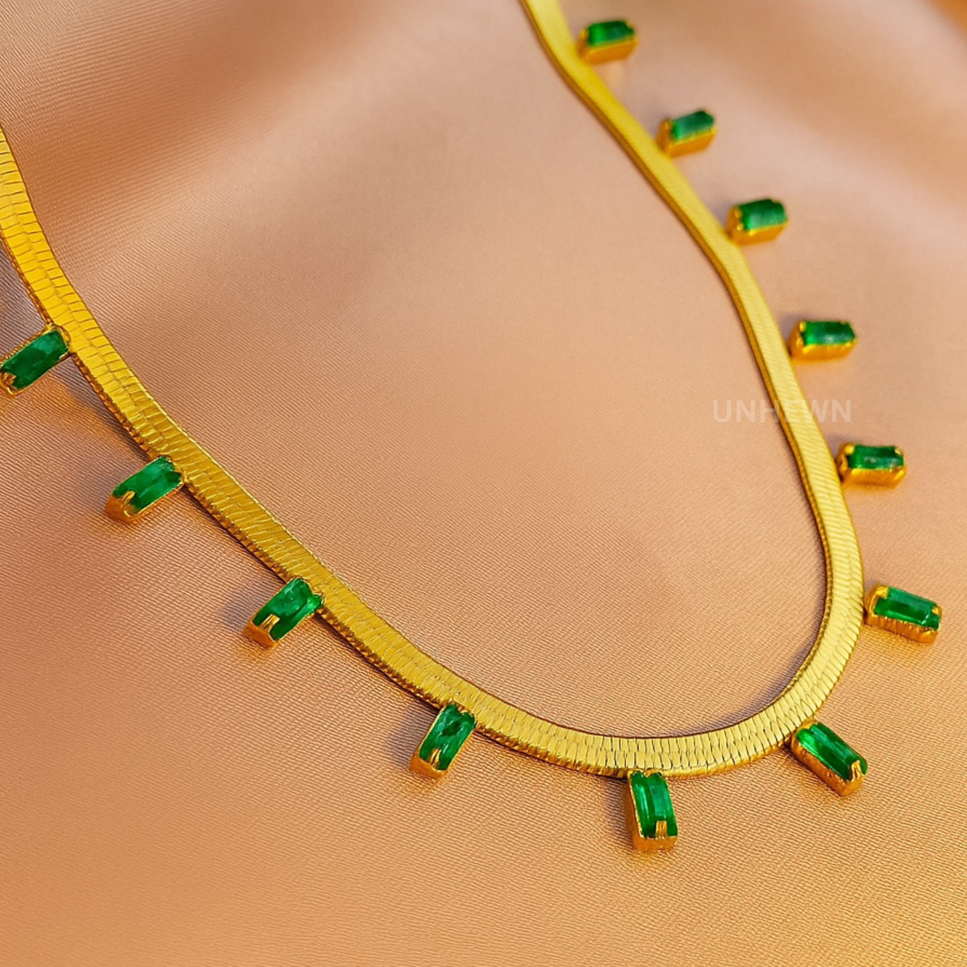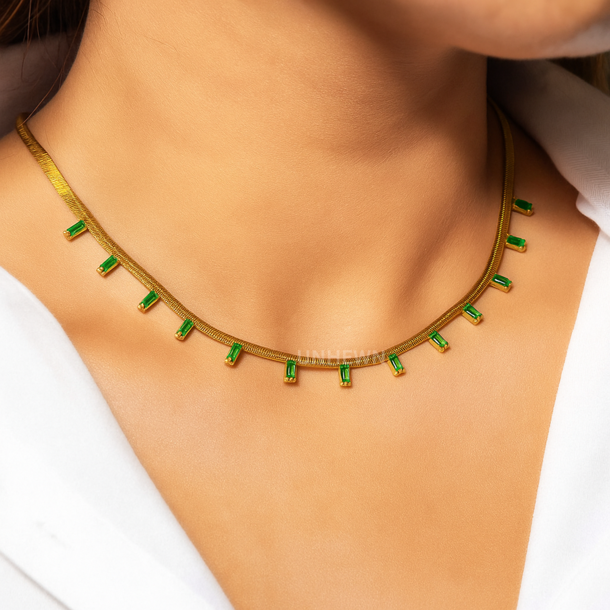 Fresh and bold, the Verde Drop Choker features a sleek gold snake chain adorned with vivid green baguette charms. Minimal yet eye-catching, it’s perfect for layering or making a refined statement on its own.